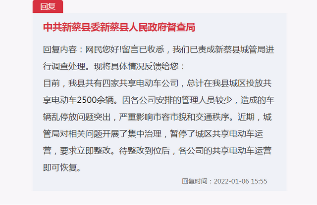 1月6日,新蔡縣對此公開回復(fù):我們已責(zé)成新蔡縣城管局進(jìn)行調(diào)查處理。現(xiàn)在將具體情況反饋給您: 目前,我縣共有四家共享電動車公司,總計(jì)在我縣城區(qū)投放共享電動車2500余輛。因各公司安排的管理人員較少,造成的車輛亂停放問題突出,嚴(yán)重影響市容市貌和交通秩序。近期,城管局對相關(guān)問題開展了集中治理,暫停了城區(qū)共享電動車運(yùn)營,要求立即整改。待整改到位后,各公司的共享電動車運(yùn)營即可恢復(fù)。 新時(shí)代消費(fèi)網(wǎng)溫馨提示:當(dāng)您的合法權(quán)益受到侵害時(shí),除了向行政機(jī)關(guān)投訴之外還可以通過新時(shí)代消費(fèi)網(wǎng)“我要投訴”欄目及關(guān)注“新時(shí)代消費(fèi)網(wǎng)”VX公眾號在快速投訴欄目進(jìn)行在線投訴,我們將聯(lián)手消費(fèi)者維權(quán)組織竭誠為您維權(quán)。(來源:新時(shí)代消費(fèi)網(wǎng))