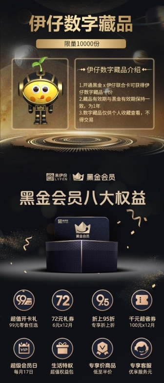 在5月20日這一別具情愫的日子里,來伊份為Z世代獻(xiàn)上了這份匠心獨(dú)具的禮品,它的價(jià)值不僅在于觀賞和收藏,更是把“心意”數(shù)字化,讓凝結(jié)著“愛意與真誠”的紀(jì)念品擁有了永恒的DNA。 本次共計(jì)發(fā)行10000份數(shù)字藏品,每一份都具有唯一性,消費(fèi)者通過開通【來伊份黑金會員X伊仔數(shù)字藏品卡】即可獲得,同時(shí)可享受來伊份黑金會員特權(quán),售完即止。 品牌破圈持續(xù)發(fā)力,私域建設(shè)成重中之重 事實(shí)上,這并非是來伊份與Z世代的首次親密接觸,在過去的兩年時(shí)間里,來伊份通過品牌形象升級、代言人、高勢能IP跨界合作,成功創(chuàng)造了與年輕消費(fèi)者溝通的社交幣,營銷活動綁定黑金會員豐富的權(quán)益加持完成私域引流。在2021年末,來伊份黑金會員的總數(shù)正式達(dá)到100萬,標(biāo)志著來伊份在私域建設(shè)層面取得了階段性成果。