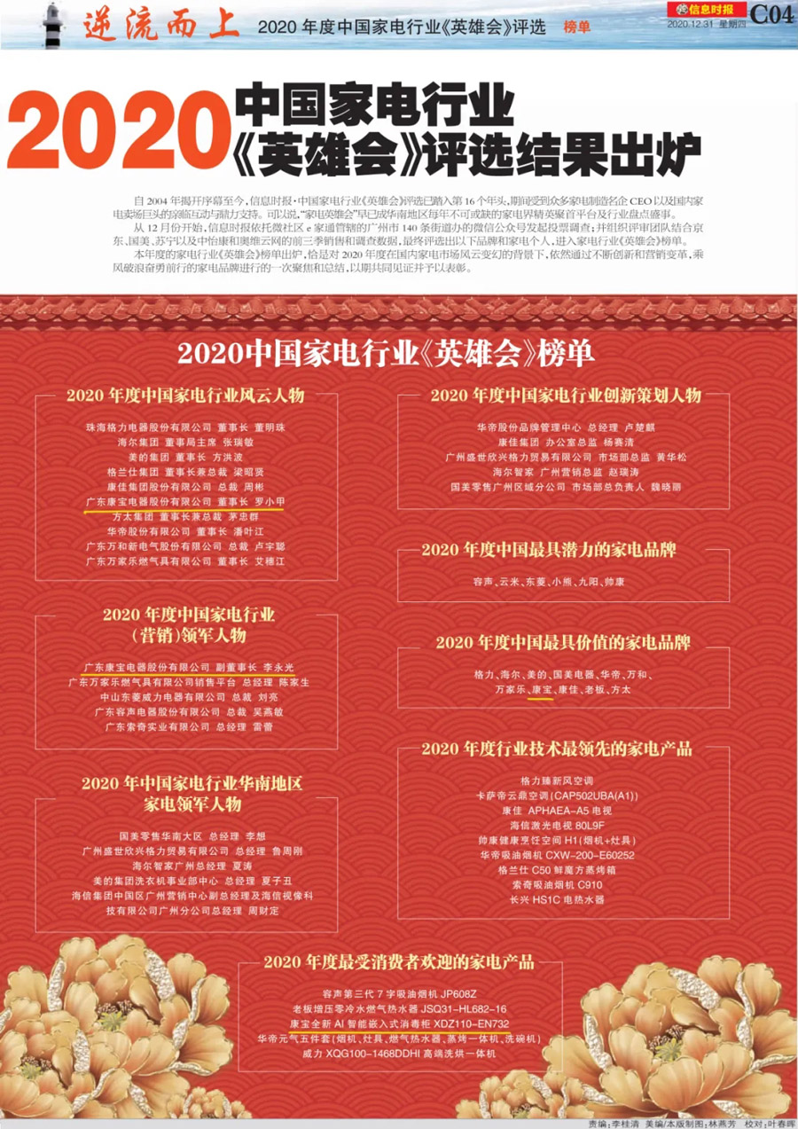 信息時報社日前發(fā)布了“2020年度中國家電行業(yè)英雄會”榜單,在本屆家電英雄會上,康寶榮獲“2020年度中國最具價值的家電品牌”;康寶董事長羅小甲獲評為“2020年度中國家電行業(yè)風(fēng)云人物”;副董事長兼常務(wù)副總裁李永光榮獲“2020年度中國家電行業(yè)(營銷)領(lǐng)軍人物”;康寶全新AI智能嵌入式消毒柜XDZ110-EN732獲評為“2020年度最受消費者歡迎的家電產(chǎn)品”??祵殞⑺拇箜棯勴検杖肽抑?,成為本屆家電英雄會的大贏家。