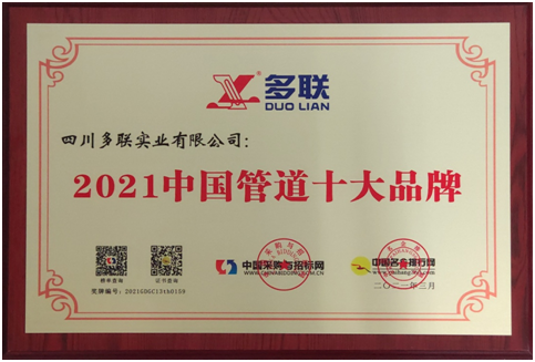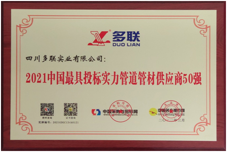 近日,在由中國采購與招標網、中國名企排行網主辦的“2021年第13屆中國管道管材招標采購評價推介活動”中,多聯(lián)實業(yè)憑借可靠的產品質量、良好的品牌美譽度贏得了使用者與參評專家一致青睞。最終,多聯(lián)實業(yè)榮獲“2021中國管道十大品牌”、“ 2021中國最具投標實力管道管材供應商50強”及“2021政府采購塑料管道十大品牌”榮譽稱號。