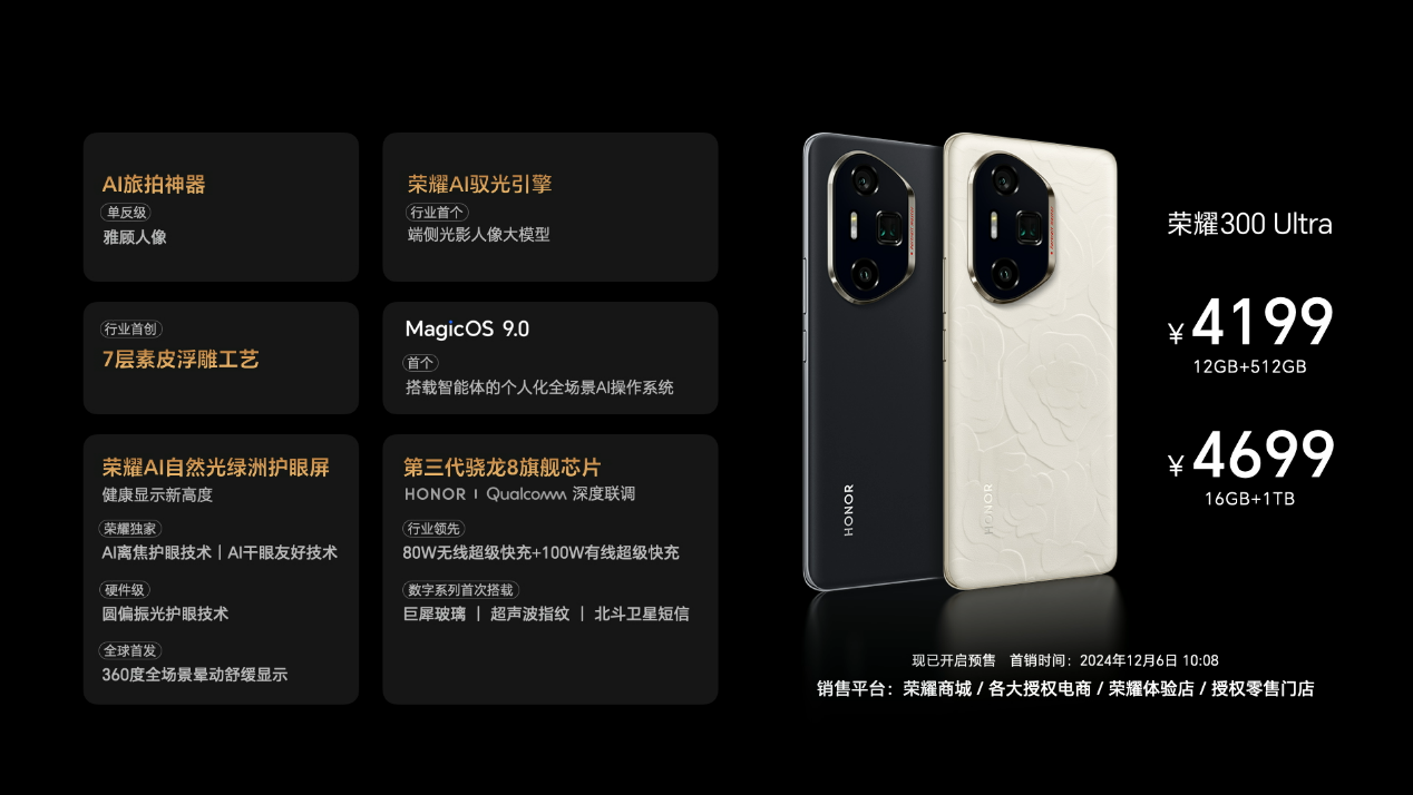2024年12月2日,在榮耀300環(huán)球旅拍新品發(fā)布會(huì)上,AI旅拍神器榮耀300系列驚艷亮相。作為科技與美學(xué)融合的榮耀數(shù)字系列最新一代產(chǎn)品,榮耀300系列迎來(lái)里程碑式升級(jí)。首次引入U(xiǎn)ltra版本,攜手標(biāo)準(zhǔn)版與Pro版,共同構(gòu)建史上最強(qiáng)的榮耀數(shù)字系列產(chǎn)品矩陣,為用戶(hù)帶來(lái)超越期待的體驗(yàn)和選擇。