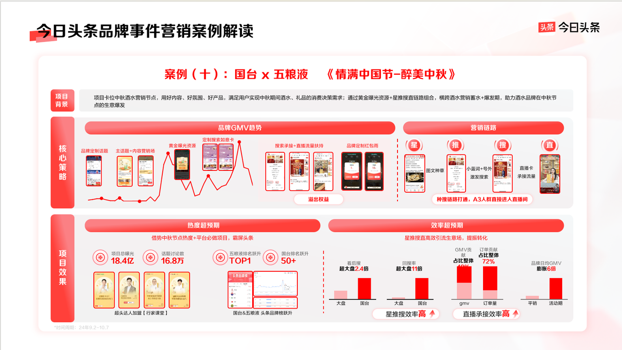 今年中秋,國(guó)臺(tái)和五糧液在今日頭條共創(chuàng)了「醉美中秋賞月指南」的熱點(diǎn)話題,把酒水選購(gòu)綁上了傳統(tǒng)佳節(jié)的氛圍,日均GMV直接干到了6倍以上,這就是熱點(diǎn)競(jìng)爭(zhēng)力的表現(xiàn),資訊消費(fèi)天然自帶強(qiáng)熱點(diǎn)屬性,既為用戶供給著源源不斷的談資,也為品牌備足了上熱點(diǎn)的門票。