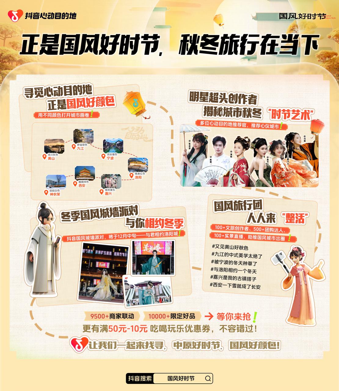 這個(gè)秋冬,抖音生活服務(wù)異地場景營銷IP「心動(dòng)目的地」打造國風(fēng)系列第二期——「心動(dòng)目的地·國風(fēng)好時(shí)節(jié)」,實(shí)現(xiàn)三重“心動(dòng)升級(jí)”:行程更心動(dòng),橫跨11至12月,將先后抵達(dá)黃山、九江、寧波、神農(nóng)架林區(qū)、洛陽、嘉興、西安七個(gè)心動(dòng)目的地,從層林浸染到大雪紛飛,在秋冬風(fēng)光淋漓盡現(xiàn)的地方,見證每一場浪漫;貨品更心動(dòng),精選地標(biāo)景區(qū)和六萬余款酒旅、餐飲商品,低至五折起,更有滿50-10元超值代金券每天限量開搶;玩法更心動(dòng),海陸、陳鶴一、司瑤等多位明星超頭出任「心動(dòng)目的地推薦官」,與你同游國風(fēng)好去處。不僅將在洛陽等地舉行「國風(fēng)城墻派對(duì)」等趣味線下大事件,還將在抖音發(fā)起#國風(fēng)好時(shí)節(jié) 線上話題互動(dòng),為創(chuàng)作者們送出豐厚流量獎(jiǎng)勵(lì)!