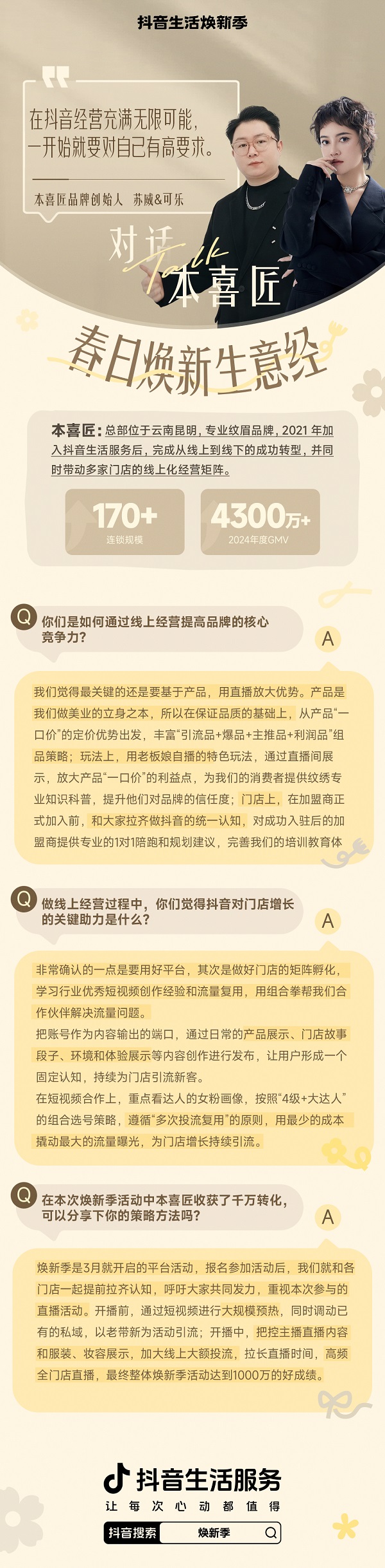 這種潛移默化的信任,還建立于本喜匠嘗試用具體的產(chǎn)品解決隱患。這次「抖音生活煥新季」,本喜匠上架了從修眉、設(shè)計到輕氧眉、絨霧眉、野生眉等覆蓋男女不同人群、低至4折的近20款產(chǎn)品。這意味著,用戶明確了自己的需求,只要下單對應(yīng)的“一口價”產(chǎn)品,到店即可使用,沒有隱形消費,沒有二次推銷。“煥新季期間,本喜匠品牌力有非常大的一個增長,會有更多的消費者來選擇我們,到我們的店里消費......”,在提到本次的活動效果反饋時,蘇威回答道。