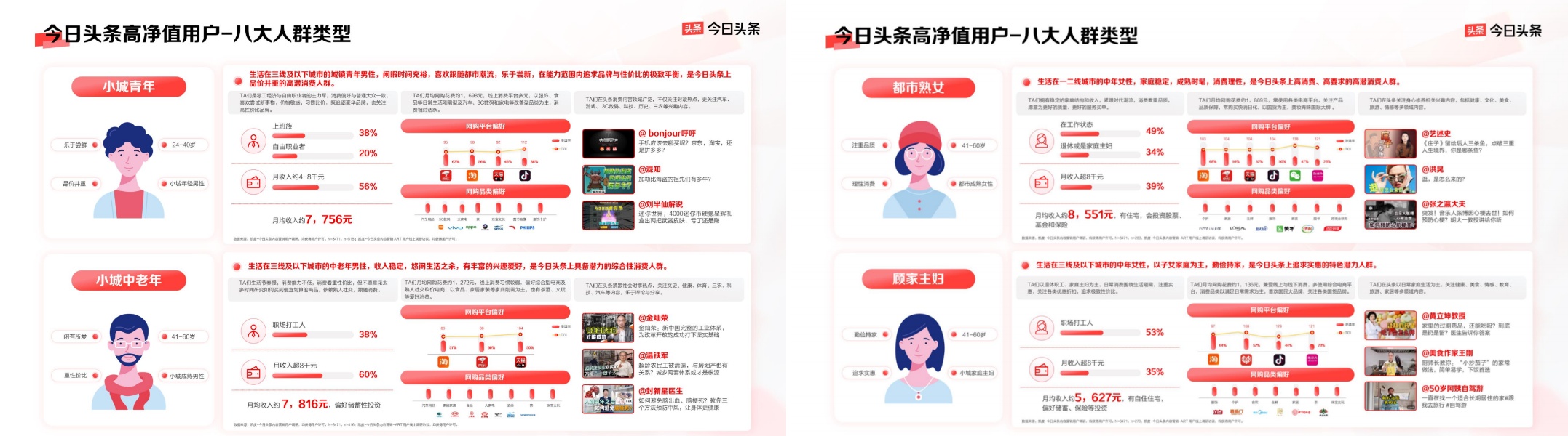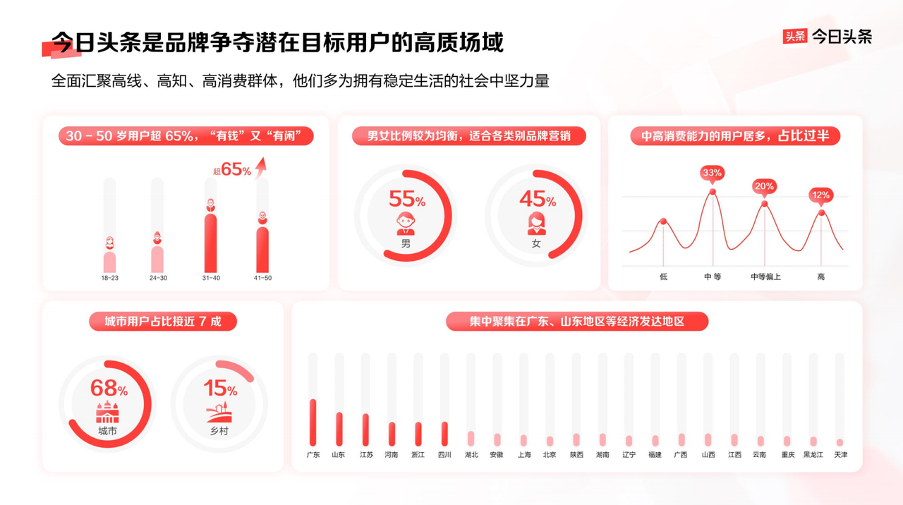 在億級體量優(yōu)勢基礎(chǔ)上,今日頭條用戶的高價值特點也十分明顯?;趶?qiáng)烈的資訊和熱點認(rèn)知,今日頭條聚集了以都市中產(chǎn)、新晉打工人、小城青年、小城中老年、精英白領(lǐng)、品質(zhì)寶媽、都市熟女、顧家主婦為主的八大高凈值用戶類型,覆蓋性別均衡、地域廣泛、興趣多元、消費力強(qiáng)勁的多元用戶圈層。