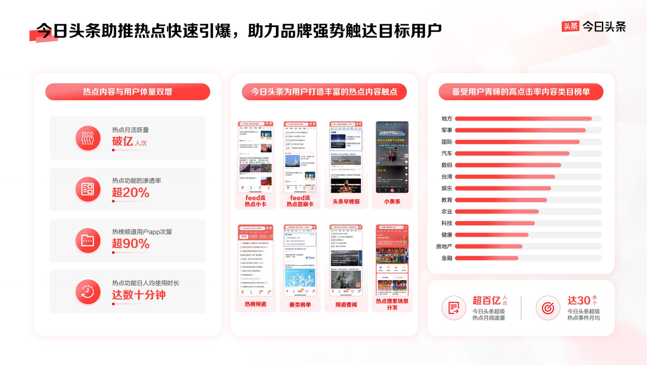 │熱點引爆力:收割話題與口碑,成就品牌營銷大事件 除了打造品牌節(jié)點營銷“話題場”,基于今日頭條“熱點”內(nèi)容的權(quán)威性、真實性、完整性、可靠性及豐富性,平臺在熱點月活躍量、熱點功能滲透率、熱點頻道用戶APP次留和熱點功能日人均使用時長等方面都具備領(lǐng)先優(yōu)勢。