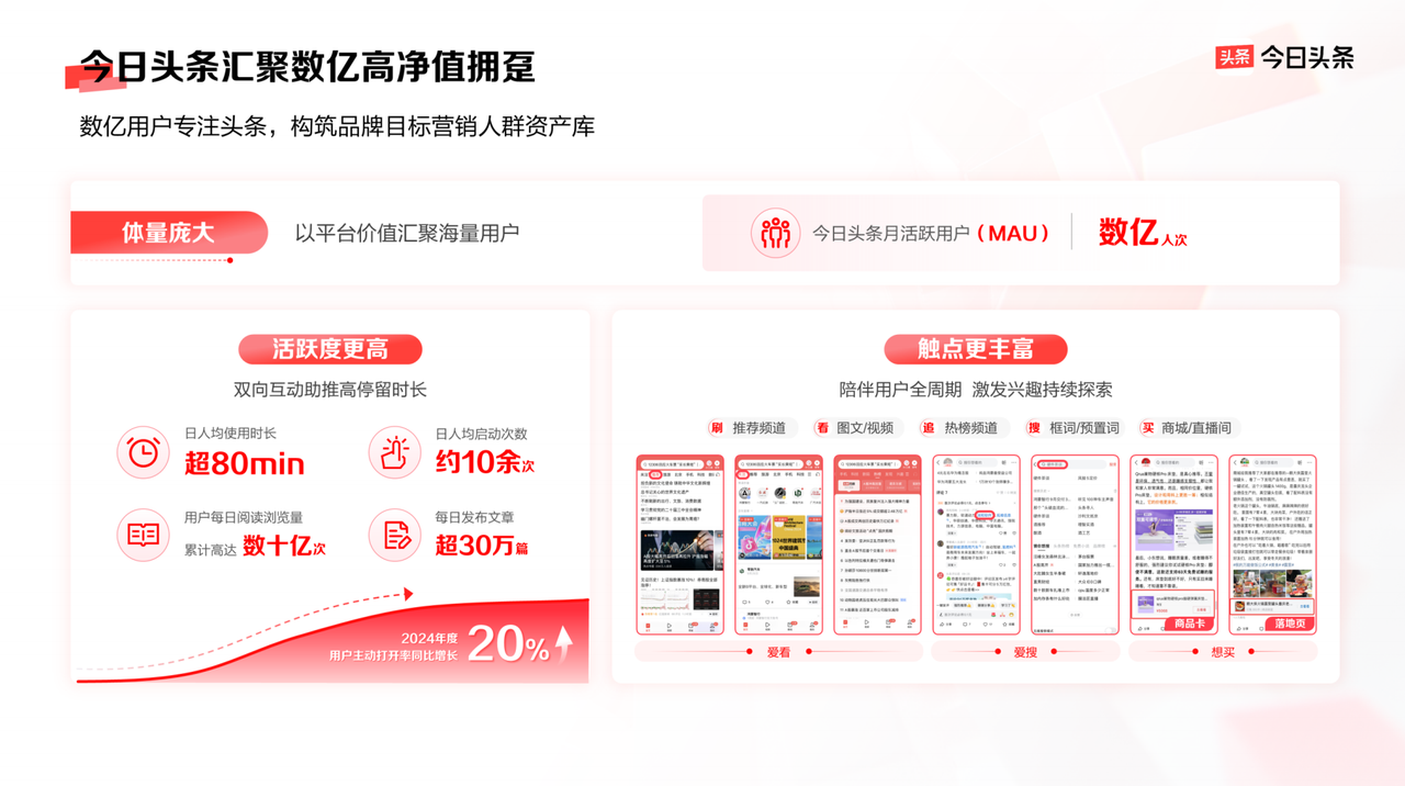 在當(dāng)今的移動互聯(lián)網(wǎng)生活中,內(nèi)容平臺型產(chǎn)品依舊占據(jù)用戶大量的消費時長,其中,資訊類內(nèi)容對用戶心智的影響尤為強(qiáng)烈。而今日頭條作為差異化特色鮮明的媒體平臺,多年來持續(xù)領(lǐng)跑熱點資訊賽道,不管是DAU、日活躍用戶數(shù),還是用戶核心的指標(biāo)時長留存上,今日頭條都積累出斷崖式優(yōu)勢,擁有穩(wěn)定、活躍的大事件營銷公信力輿論場域——如此龐大的用戶規(guī)模和信任生態(tài),對于今天的品牌營銷來說,可謂助益非凡。