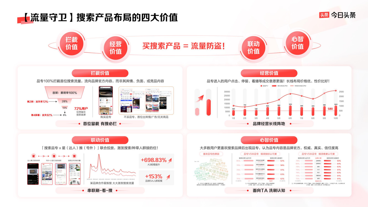如此大體量、多元化、高凈值的用戶群體共同構(gòu)成了今日頭條優(yōu)質(zhì)的創(chuàng)作者生態(tài),并在“邊看邊搜” (看后搜達(dá)70%)的用戶新趨勢作用下,與平臺“創(chuàng)新內(nèi)容力”、“熱點引爆力”以及“多元產(chǎn)品力”協(xié)同打造品牌一站式“種-收”閉環(huán),有效助推用戶購買力在品牌營銷場域集中爆發(fā)。