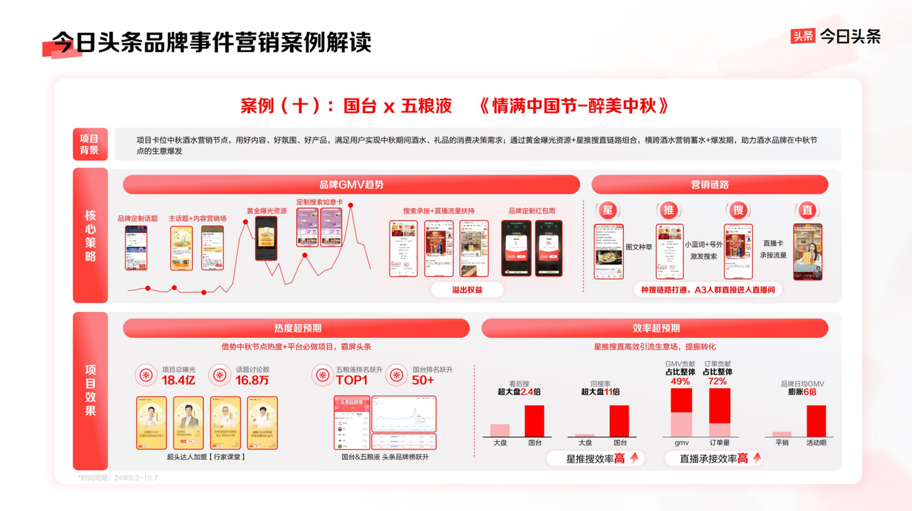接下來,如何助力品牌節(jié)點生意爆發(fā)?今日頭條選擇以“黃金曝光資源+星推搜直鏈路”組合,高效引流品牌生意場,打造“種-搜-拔”的轉(zhuǎn)化閉環(huán),有效縮短決策鏈路,讓用戶消費路徑更絲滑順暢,品牌日均GMV膨脹6倍,GMV貢獻(xiàn)占比整體49%。