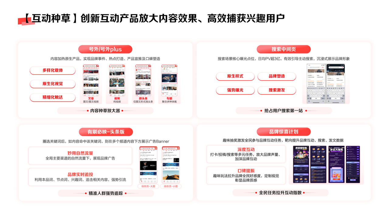 │多元產(chǎn)品力:品牌傳播全場景覆蓋,矩陣式打造種草閉環(huán) 值得注意的是,今日頭條多元創(chuàng)新的產(chǎn)品矩陣也成為品牌營銷講故事、拓場景、訴情緒的價值護(hù)城河。從“黃金曝光點位”、“品牌互動體驗”到“產(chǎn)品價值引流”、“搜索高效種草”,既高效通連,又各有所長,通過在實踐中靈活組合,便能為品牌帶來高效率的閉環(huán)轉(zhuǎn)化。