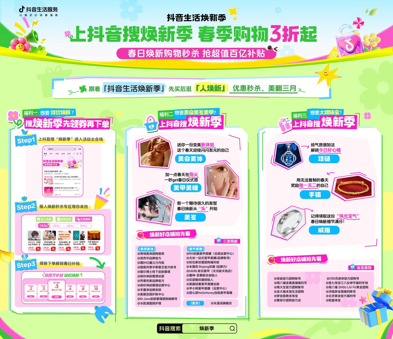 本周更有黃燦燦、張藝凡空降抖音生活煥新季,開啟「人煥新」專場優(yōu)惠活動,帶你解鎖春日變美新體驗!