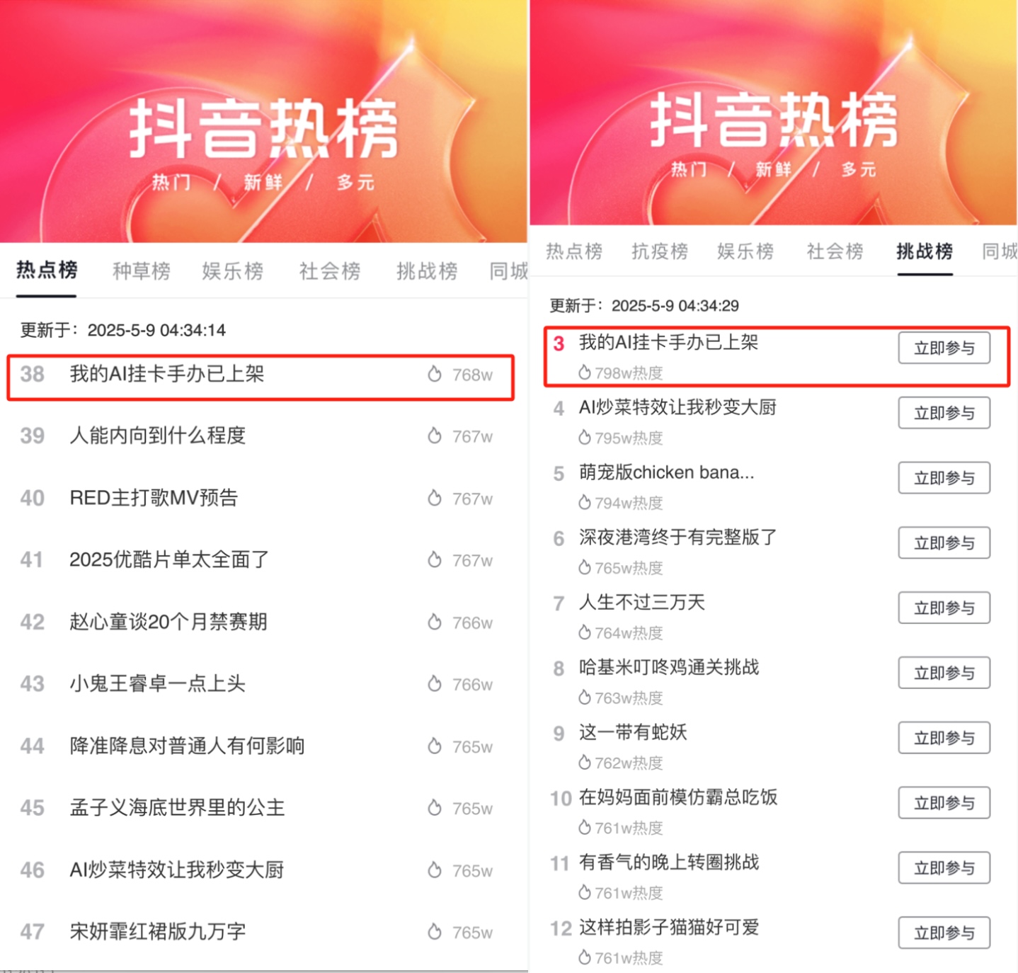 截至5月15日14點(diǎn),#我的AI掛卡手辦已上架 話(huà)題投稿量近萬(wàn) ,最高登陸站內(nèi)總榜TOP38、挑戰(zhàn)榜TOP3。