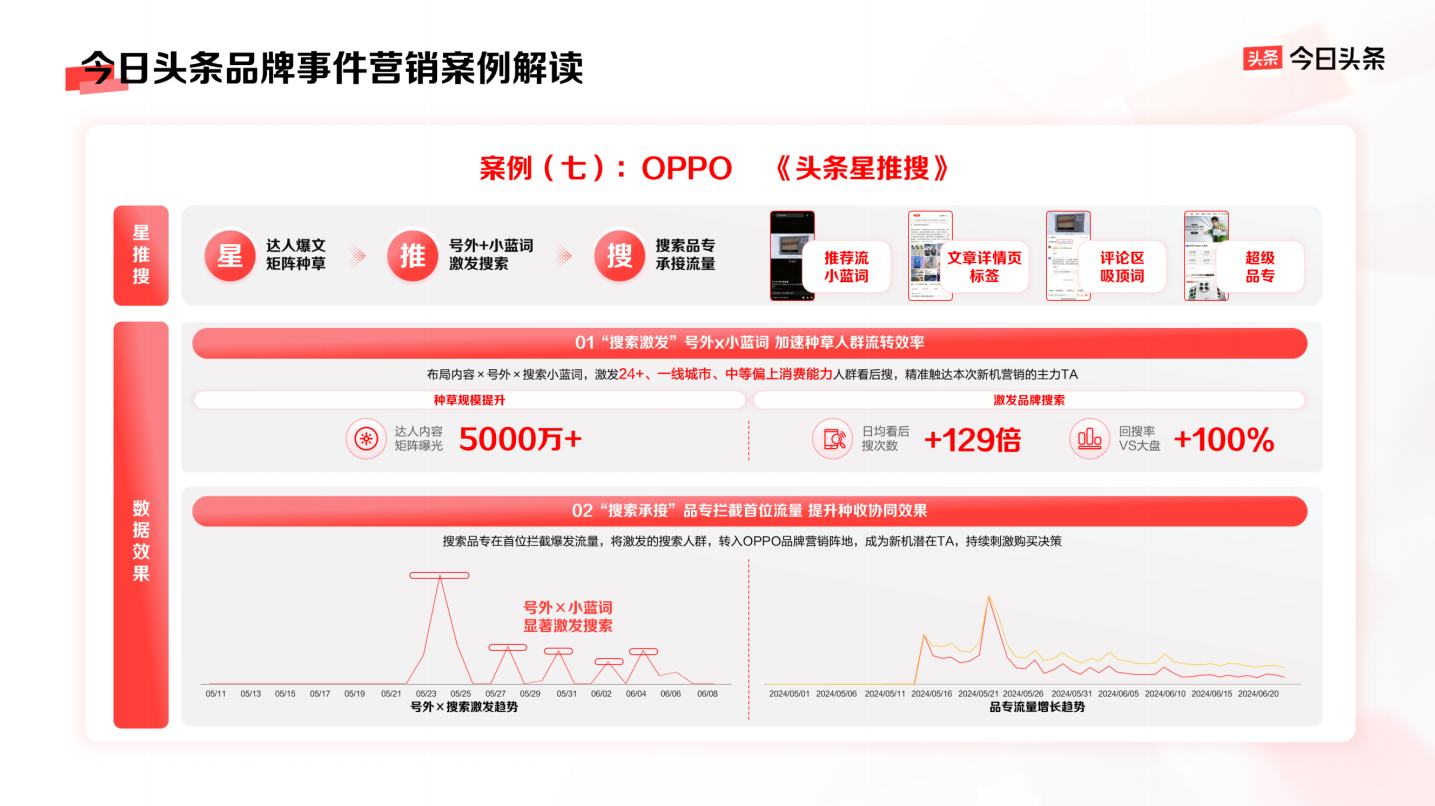 如OPPO新機上線。今日頭條配合品牌布局頭條星推搜,針對性觸達(dá)24+、一線城市、中等偏上消費能力人群,激發(fā)其看后搜動作。通過達(dá)人爆文矩陣種草、號外+小藍(lán)詞激發(fā)搜索、搜索品專承接流量,層層遞進(jìn),協(xié)助OPPO新機獲得5000萬+曝光,激發(fā)日均看后搜次數(shù)增長129倍、回搜率對比大盤增加100%。今日頭條幫助品牌在新品上市期精準(zhǔn)觸達(dá)高潛用戶人群,搶占先機。