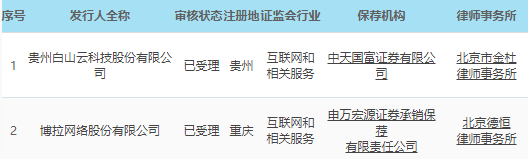 其中,博拉網(wǎng)絡(luò)屬于互聯(lián)網(wǎng)和相關(guān)服務(wù)行業(yè),擬融資金額為5.05億元,保薦機(jī)構(gòu)是申萬宏源證券。白山科技同樣屬于互聯(lián)網(wǎng)和相關(guān)服務(wù),擬融資金額8.43億元,保薦機(jī)構(gòu)為中天國(guó)富證券。
