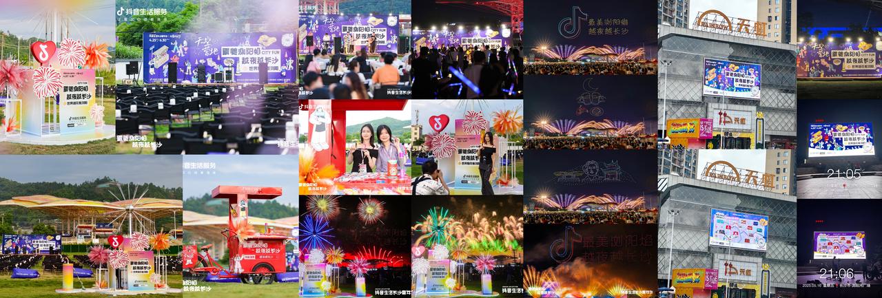 在素有“世界煙花之都”之稱的瀏陽,抖音生活服務(wù)聯(lián)動瀏陽政府、大吉煙花、天空營地,為本次活動進(jìn)行了IP定制的沉浸式煙花秀,成功引爆了一波湖南夜游熱潮。五一假期在瀏陽上空驚喜點(diǎn)亮“最美瀏陽焰,越夜越長沙”星空標(biāo)語,5月17日在瀏陽天空劇院上演抖音專屬煙花秀和無人機(jī)秀,多架無人機(jī)同步編隊演繹夜長沙經(jīng)典場景:岳麓山愛晚亭的飛檐輪廓、毛主席雕像的剪影與瀏陽天空劇院的絕美穹頂交替閃現(xiàn);夜色漸深時,舉著鉗子的小龍蝦、瀏陽的蒸菜與冒著氣泡的啤酒杯互相捧杯,將“瀏陽焰”“夜長沙”兩大主題向數(shù)十萬觀眾展現(xiàn)。