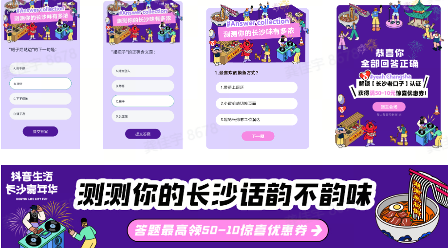 活動還為參與用戶提供了滿滿福利!參與漫游地圖活動并到店互動,可以獲得夜長沙周邊禮品,上抖音搜索“越夜越長沙”,進(jìn)入會場參與《長沙話等級考試》互動答題還能贏滿減消費(fèi)券。