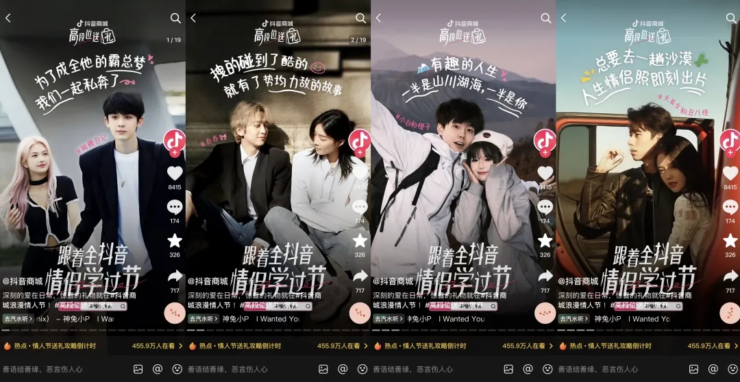 首先一大亮點(diǎn),是抖音電商巧妙利用情人節(jié)的獨(dú)特情感氛圍,邀請(qǐng)情侶達(dá)人參與到活動(dòng)中,創(chuàng)作優(yōu)質(zhì)內(nèi)容,借助情侶之間真摯的情感表達(dá),引起目標(biāo)受眾的情感共鳴,增強(qiáng)用戶對(duì)情人節(jié)送禮文化的認(rèn)同。