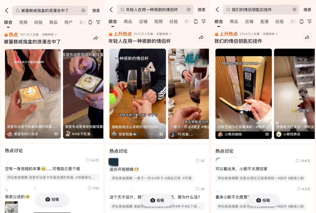 值得一提的是,抖音電商呈現(xiàn)出由趣味性、奇特性與特殊性等類型的小單品引發(fā)熱點(diǎn)趨勢。在# 被蛋糕戒指盒的浪漫擊中了 ,#年輕人在用一種很新的情侶杯、#我們的情侶鑰匙扣掛件等話題推動(dòng)下,那些給人帶來驚喜與浪漫的小眾禮物引發(fā)了大量關(guān)注。憑借其匠心獨(dú)運(yùn)的小單品,諸多商家在競爭激烈的大促中嶄露頭角,銷量直線上升。