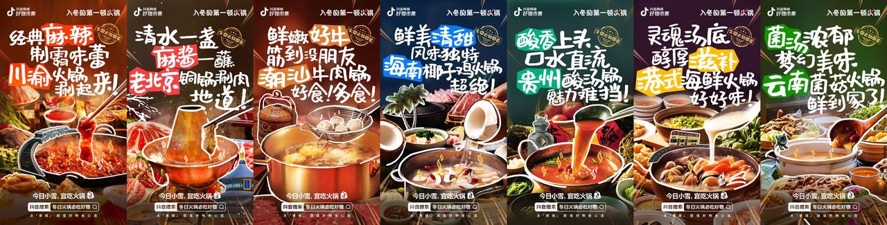為了吸引更多用戶關(guān)注活動(dòng),「抖音商城好物市集」在小雪當(dāng)日推出節(jié)氣創(chuàng)意海報(bào),以“今日小雪 宜吃火鍋”的溝通,喚醒消費(fèi)需求,展示各地特色火鍋特色,搶占用戶的心智。