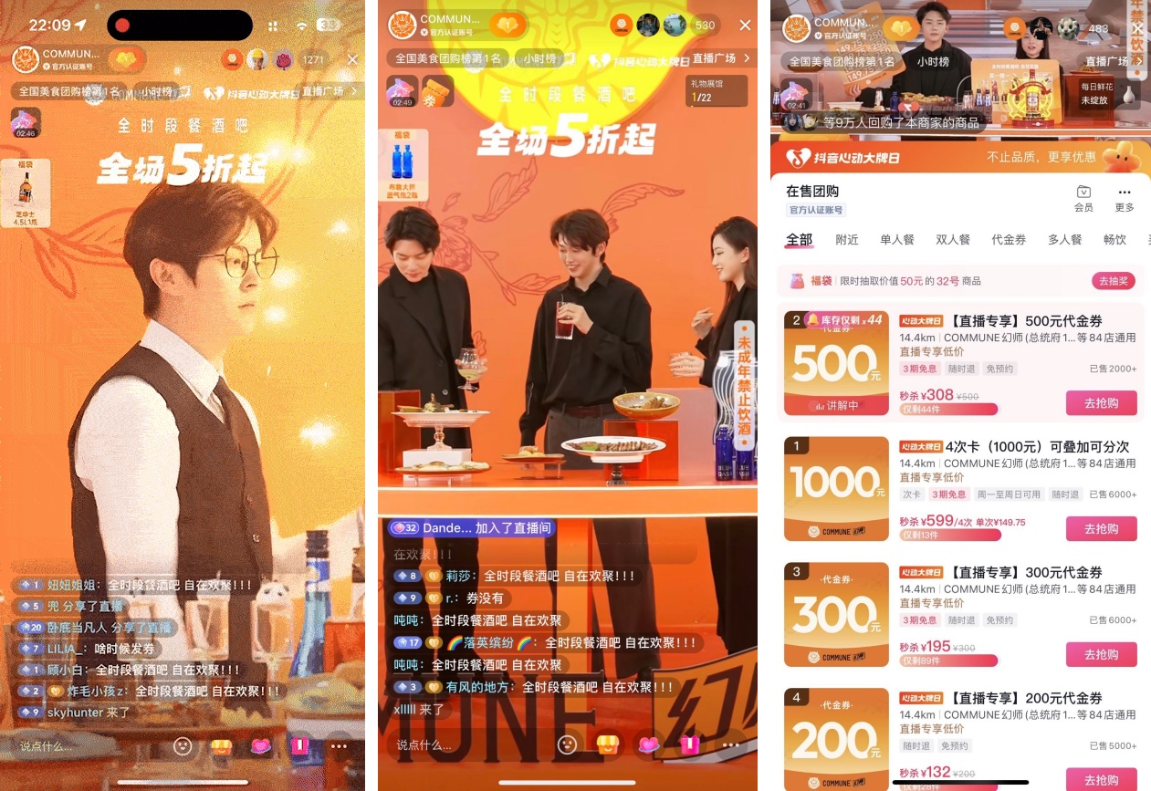 在直播間炫酷觀展、感受光影的觥籌交錯(cuò),是種怎樣的超絕體驗(yàn)?COMMUNE利用抖音直播效果打造了一場(chǎng)光影藝術(shù)展年度直播“大事件”,借助LED科技與光影藝術(shù),營(yíng)造出從凌晨至深夜各個(gè)時(shí)段沉浸式氛圍與時(shí)空穿越的奇妙感受,整體的場(chǎng)景搭建視覺(jué)張力滿(mǎn)分。另外,直播間爆品福利也依舊亮眼吸睛,不僅為大家推出了低至六折的100、200、500等多面額代金券和次卡優(yōu)惠,更有招牌披薩、德式脆皮豬肘爆品、雞尾酒、人氣必喝特飲等單品以及新品雙人、多人好吃套餐、暢享生啤套餐等,針對(duì)性地滿(mǎn)足了不同人群的多場(chǎng)景消費(fèi)需求,直播間內(nèi)還隨機(jī)降落每桌必點(diǎn)招牌單品和小酒桶的秒殺及免單券……這種有趣且有料的直播模式,共同助推COMMUNE直播間最終GMV突破千萬(wàn)大關(guān),創(chuàng)下了抖音生活服務(wù)異國(guó)菜品類(lèi)單日直播的交易峰值。