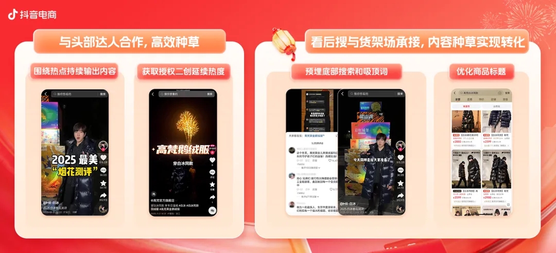 同時,高梵官方旗艦店在達(dá)人評論區(qū)互動認(rèn)領(lǐng),獲取達(dá)人授權(quán)二創(chuàng)視頻延續(xù)熱度,吸引中小達(dá)人創(chuàng)作,熱度不斷攀升。在此基礎(chǔ)上,高梵預(yù)埋底部搜索和吸頂詞#高梵黑金羽絨服,“高梵白冰同款”,并結(jié)合小藍(lán)詞優(yōu)化商品標(biāo)題SEO,加速了生意的轉(zhuǎn)化。自1月以來,日均搜索商品卡GMV對比雙11爆發(fā)提升43%。