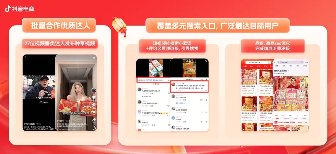 三只松鼠則合作近30位食品垂類優(yōu)質(zhì)達(dá)人,集中發(fā)布年貨種草短視頻,有效提升產(chǎn)品的市場熱度與消費(fèi)者的購買興趣,并通過短視頻掛搜索小藍(lán)詞“三只松鼠堅(jiān)果禮盒”,評論區(qū)置頂鏈接等多種形式引導(dǎo)用戶搜索、購買產(chǎn)品。同時,搜索結(jié)果頁通過品專、商品SEO優(yōu)化等動作完成精準(zhǔn)流量承接,搜索量環(huán)比提升264%、搜索GMV環(huán)比增加132%。