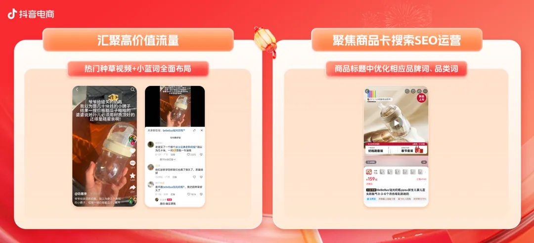 匯聚高價值流量、養(yǎng)出小藍(lán)詞后,商品的高效承接同樣十分關(guān)鍵。年貨節(jié)期間,bebebus鉆光奶瓶通過「熱門種草視頻+小藍(lán)詞布局」觸達(dá)潛力目標(biāo)客群后,聚焦商品卡搜索SEO運(yùn)營,在商品標(biāo)題中優(yōu)化相應(yīng)品牌詞、品類詞,讓商品卡自然流與商業(yè)流雙雙提效,達(dá)成鉆光奶瓶商品搜索成交人數(shù)上升150%,品牌整體商品曝光人數(shù)環(huán)比上漲60%。
