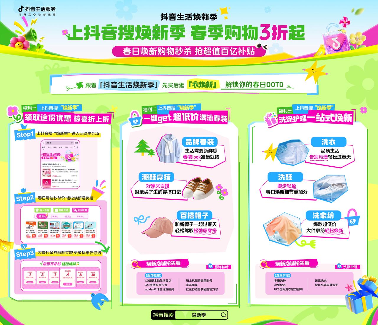上抖音搜“煥新季”進(jìn)入活動(dòng)主會(huì)場(chǎng),春日洗滌護(hù)理超低價(jià),百搭春裝鞋帽單品秒殺等春日煥新購(gòu)物火熱進(jìn)行中。進(jìn)入店鋪隨時(shí)囤券,煥新季承包你的春季衣櫥,還可以一站式完成洗滌護(hù)理衣煥新,細(xì)節(jié)呵護(hù)到位,里里外外為品質(zhì)生活加分!