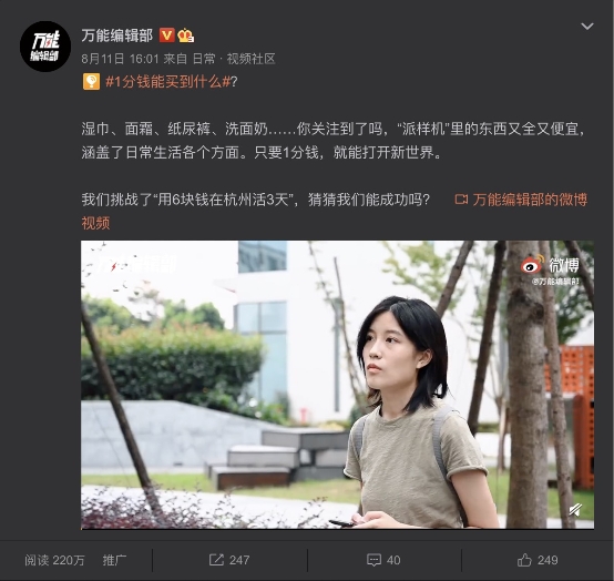 U-box“人群定制”試用禮盒精準聚焦媽媽、白領人群;U秀報告,聚焦“新品購前決策”,深度追蹤種子用戶從被挖掘、發(fā)酵到回購轉化的全鏈路表現(xiàn)。U先頻道,匯集千萬級嘗鮮人群圖文、視頻試用體驗心得,為品牌產品的口碑傳播與社交內容沉淀持續(xù)加碼。頻道固定周期更新的超級派營銷活動,更是擁有明星+KOL+站外媒體投放曝光的組合加持,成為品牌拉新擴人群的重要活動。 而U-team項目則坐擁淘寶最大規(guī)模的大學生群聊陣地,通過遍布各大高校的派樣機覆蓋了超200萬的學生群體,聚集起了近30萬的大學生社群,為品牌營銷蓄水大量年輕消費群體。對于想要在雙11精準收獲年輕化流量的品牌而言,天貓U先無疑是年輕流量賽道的最佳助力之一。 法國天然護膚品牌歐舒丹自2018年2月首次嘗試接入天貓U先平臺服務后,經過3年的深度聯(lián)動,已將后者作為新品派樣、品牌招新以及大促的重點發(fā)力渠道,并且基于品牌回購券、邀請卡、數(shù)據銀行等配套產品服務,實現(xiàn)持續(xù)有效地二次觸達消費群體。HR赫蓮娜,亦通過試用形式實現(xiàn)了品牌在618期間的銷售爆發(fā)。由此可見,天貓U先為品牌帶來的,不僅僅是一個簡單的派樣平臺和招新引流渠道,它更是一個內容、社群加持的消費者連結生態(tài)場,基于“先試后買”的核心消費形式為品牌沉淀豐富的人群資產。 精準卡位目標人群,引領消費“嘗新”文化 天貓U先平臺能夠助力品牌在天貓雙11搶跑品牌大促,其關鍵之一在于對于目標消費群體的深度洞察,牢牢抓住了雙11消費者先試用再做購買決策的核心需求。 尤其對于以好奇驅動消費的年輕消費者而言,“嘗新文化”已經成為了主流消費文化之一。 通過天貓U先平臺,年輕消費者們可以掌握最全面的大牌權益,隨時隨地超值嘗鮮,更低成本的大牌試用大大降低了年輕用戶們的購物決策成本,也增進了品牌和年輕用戶的有效連接。 基于天貓U先平臺“派樣”所帶來的消費權益,有媒體發(fā)起來了一個趣味的“用6塊錢在杭州活3天”挑戰(zhàn),通過“派樣機”獲得日常生活的所需產品。它的最大意義不在于靠“派樣”活下去,而是告訴大家小小派樣機里藏著的巨大市場和生活便利。