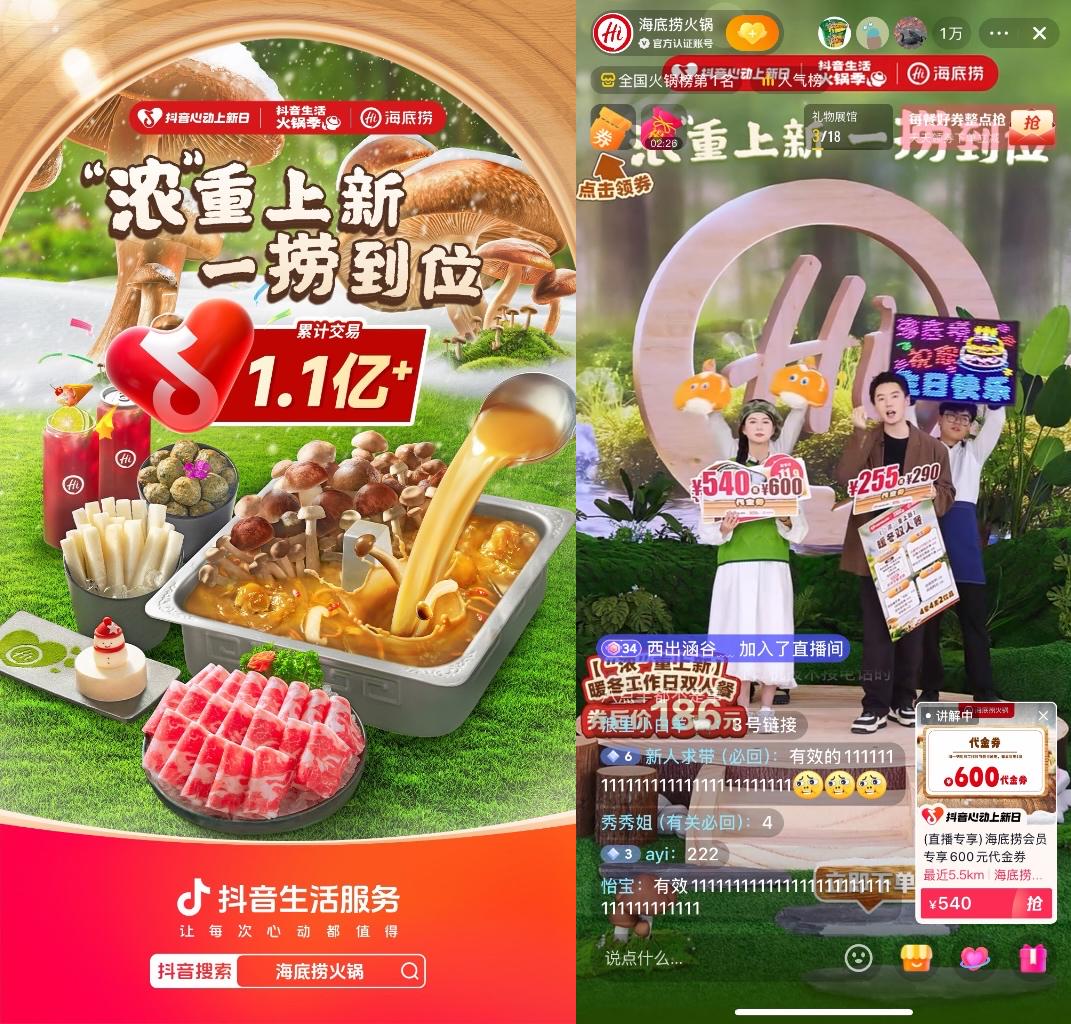 11月14日至11月17日,海底撈為貼合用戶火鍋季多元需求,攜手「抖音心動上新日」,共同推出“濃重上新,一撈到位”的撈撈上新活動。嚴(yán)選五種珍稀菌菇優(yōu)質(zhì)食材,經(jīng)過精心研磨、細(xì)致品鑒與長時間熬煮等多道繁瑣工序,最終將「濃濃濃菌湯鍋」這一重量級新品搬上“撈粉”們的餐桌,與大家一起享受沸騰冬日。