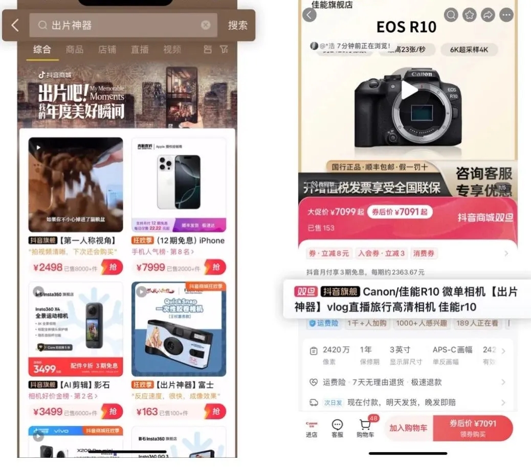 在這個(gè)過(guò)程中,搜索發(fā)揮著關(guān)鍵作用。比如,隨著年末到來(lái),抖音用戶紛紛打開(kāi)相冊(cè)回顧這一年的精彩瞬間,在“出片吧!我的年度美好瞬間”等話題下分享照片,營(yíng)造滿滿的儀式感。佳能捕捉到這一趨勢(shì),通過(guò)內(nèi)容的批量種草,引導(dǎo)用戶搜索“出片神器”,將其孵化成熱門(mén)搜索小藍(lán)詞。此外,品牌還積極進(jìn)行商品的標(biāo)題優(yōu)化,提升占詞效率,提升流量承接,帶動(dòng)了單品和全店業(yè)績(jī)的爆發(fā)。