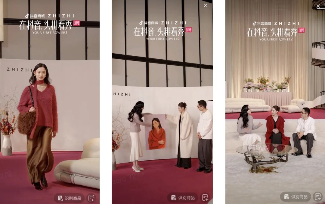 比如在時(shí)尚領(lǐng)域,“ZHIZHI 致知”把時(shí)裝秀玩出了“新花樣”,直接將傳統(tǒng)秀場(chǎng)搬到了抖音直播間。品牌像辦“閨蜜聚會(huì)”一樣,布置了生活氣息濃厚的秀場(chǎng),瞬間拉近了T臺(tái)與觀眾之間的距離,讓人倍感溫馨和親切。