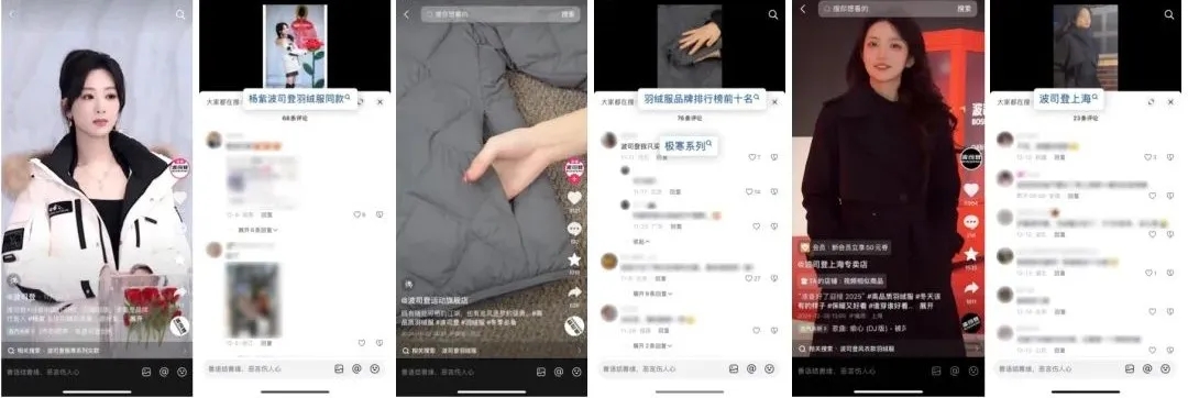 除了抓住熱點(diǎn)時(shí)機(jī),打造差異化賬號(hào)矩陣,分發(fā)多樣化內(nèi)容,并用不同的搜索詞承接,同樣有利于滿足用戶不同決策階段的需求。波司登就很好地實(shí)踐了這一點(diǎn),旗下短視頻賬號(hào)各有側(cè)重:官方賬號(hào)主打品牌調(diào)性,通過(guò)明星街拍、時(shí)尚大片激發(fā)興趣;品類店鋪專注產(chǎn)品細(xì)節(jié)展示,幫助用戶深入了解;地區(qū)門(mén)店則突出本地穿搭場(chǎng)景,助力用戶做出消費(fèi)決策。