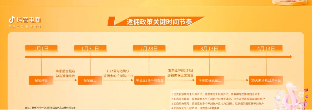 目前報名已于1月1日開啟,持續(xù)至1月31日。其他返傭政策關(guān)鍵時間節(jié)奏也已經(jīng)為大家劃好重點了。1月22日勾選確認返傭金的千川賬戶ID;2月28日平臺成功返還3%千川傭金。劃重點,千川ID確認截止時間為3月13日,到4月13日時,商家還未綁定千川賬戶,或未消耗完畢的傭金將視為無效。