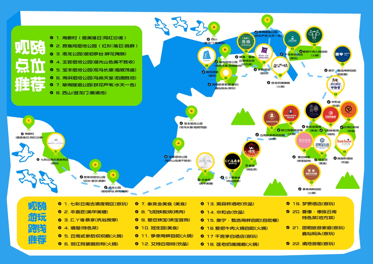 碧波浩瀚,長堤環(huán)繞,波光粼粼的滇池水面上群鷗紛飛,冬天來昆明躺一躺,沒有觀鷗喂鷗是不完整的。為了讓市民游客能夠更方便地觀賞海鷗,抖音生活服務邀請奧寧甄選海鮮自助、季幸海鮮自助、黑森林酒吧、匡老奶攤攤鵝等20余家本地頭部餐飲、綜合行業(yè)商家,以及七彩云南古滇度假區(qū)、滇池游船、昆明旅游索道等5家本地文旅品牌,聯(lián)合策劃推出“觀鷗吃喝玩樂指南”打卡線路圖,誠邀全國游客跟著觀鷗地圖打卡,奔赴一場“鷗”遇春城的詩意清歡,體驗“有一種叫云南的生活”。