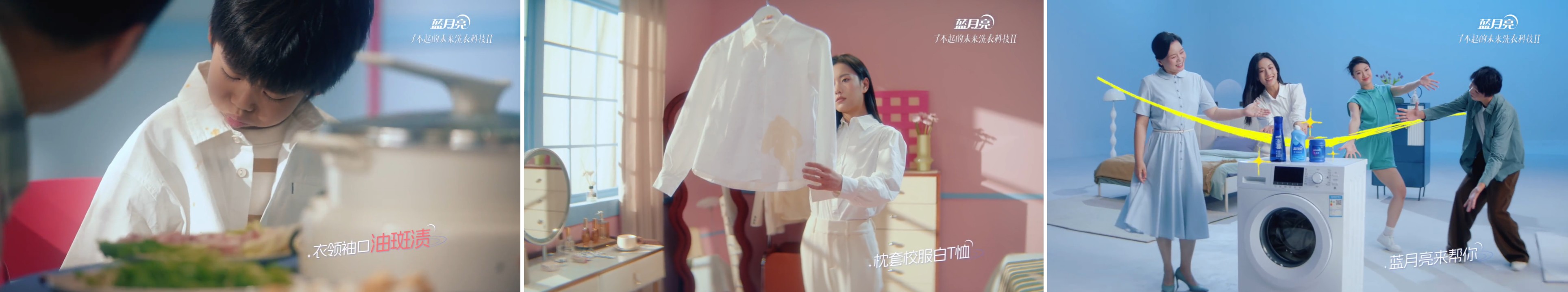 隨著魔性洗腦的 “嚕啦嚕啦咧 嚕啦嚕啦咧” 前奏響起,龔琳娜化身“首席體驗官”,手持藍月亮系列產(chǎn)品穿梭于令人頭疼的生活場景中:吃火鍋時滴落的油漬、意外灑到白襯衣上的咖啡漬,以及如何設(shè)定不同衣物的機洗模式……面對這些棘手洗衣問題,她以歡快的節(jié)奏唱出 “一涂二泡選時長 至尊洗衣三錦囊”,將藍月亮的科學洗衣方法化作朗朗上口的旋律,讓洗衣科技隨著音樂節(jié)奏深植觀眾腦海。