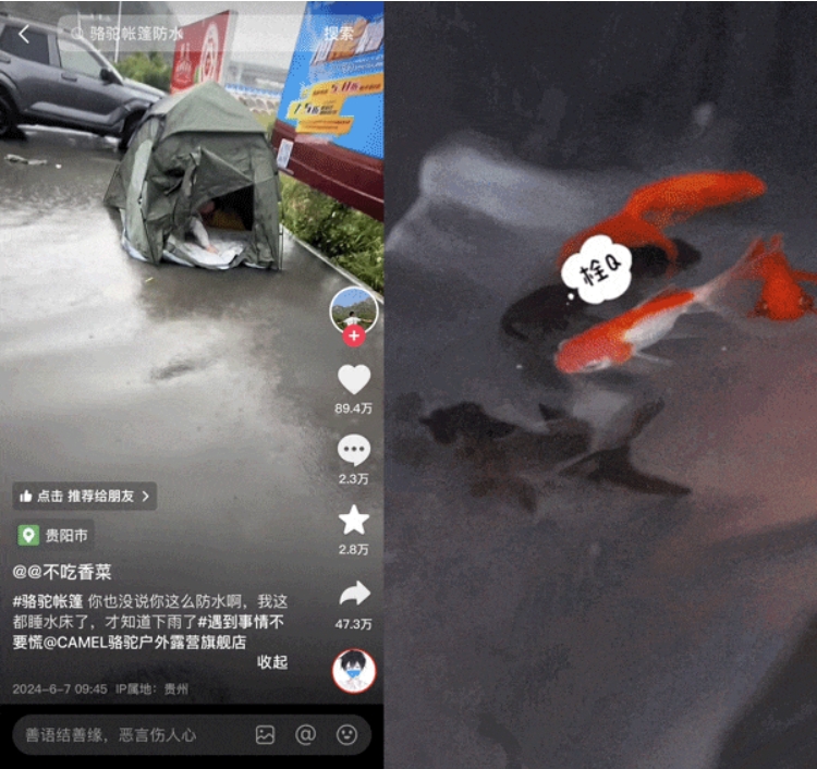 今年 6 月,有抖音用戶曬出了一段「漂流」奇遇:自己在外搭帳篷過夜,突遇大雨漲水,絲毫沒有進(jìn)水的帳篷竟然漂浮在水上了。因?yàn)樾Ч^直觀,相關(guān)話題開始發(fā)酵,突發(fā)熱點(diǎn) #第一次見這么防水的帳篷 登上種草榜 TOP 8,帳篷的品牌方駱駝火速下場認(rèn)領(lǐng)了這一話題,與用戶熱情互動(dòng),同時(shí)品牌直播間也及時(shí)跟進(jìn)熱點(diǎn),現(xiàn)場演繹「帳篷養(yǎng)魚」,再現(xiàn)硬核防水功能。