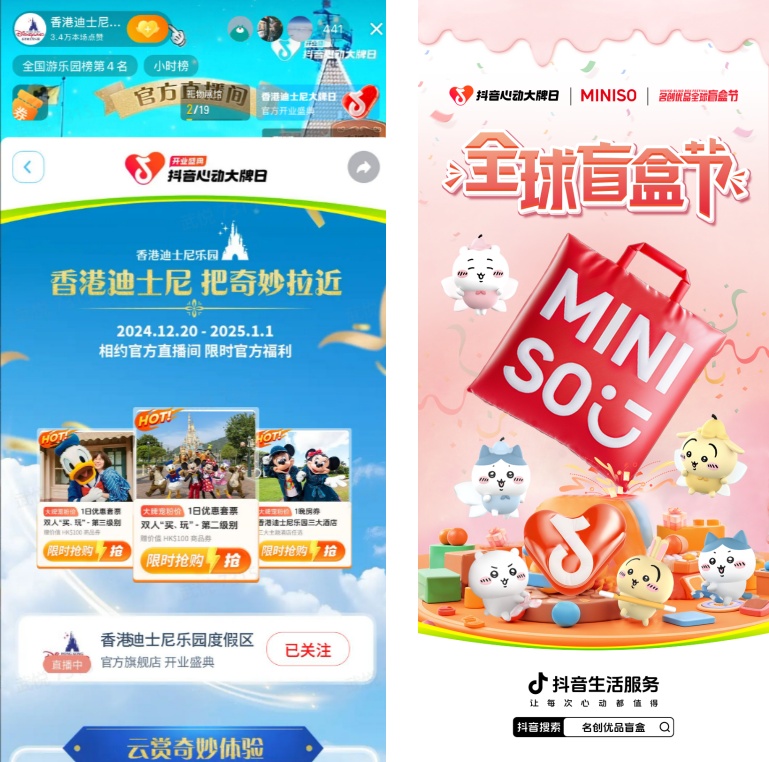 不止有日常“吃喝”需求的深度滿足,全方位愉悅心靈的“玩樂購(gòu)”體驗(yàn)也為大家統(tǒng)統(tǒng)安排到位。首次正式入駐抖音的北京環(huán)球度假區(qū)度假區(qū)旗艦店,攜手「抖音心動(dòng)大牌日」帶來(lái)了獨(dú)家精選等眾多爆款產(chǎn)品,無(wú)論是計(jì)劃家庭出游還是與朋友小聚,閉眼囤購(gòu)一份特惠套餐,即可省心盡享超值體驗(yàn);亞特蘭蒂斯品牌則攜手「復(fù)星家庭季」與「抖音心動(dòng)大牌日」雙IP,憑實(shí)力打造年度盛典,滿載誠(chéng)意攜手廣大用戶一起共度閃耀“星”年;同樣首次加入抖音平臺(tái)的香港迪士尼樂園度假區(qū)也在年末限時(shí)放送官方超級(jí)福利,圣誕節(jié)點(diǎn)的驚喜福利玩法更是讓人大呼過(guò)癮,讓你與奇妙體驗(yàn)實(shí)現(xiàn)0距離接觸;名創(chuàng)優(yōu)品MINISO重磅啟動(dòng)全球盲盒節(jié),發(fā)起12月心動(dòng)優(yōu)品優(yōu)惠大放送,涵蓋直播間專享低至66折優(yōu)惠、盲盒福袋驚喜隨機(jī)掉落、以及超值盲盒買一贈(zèng)一等多重福利,更有超值兌換玩法,僅需99元即可換得價(jià)值199元的盲盒福袋,以持續(xù)拉近與目標(biāo)消費(fèi)群體的心理距離,與大家一同捕捉新年美好瞬間。