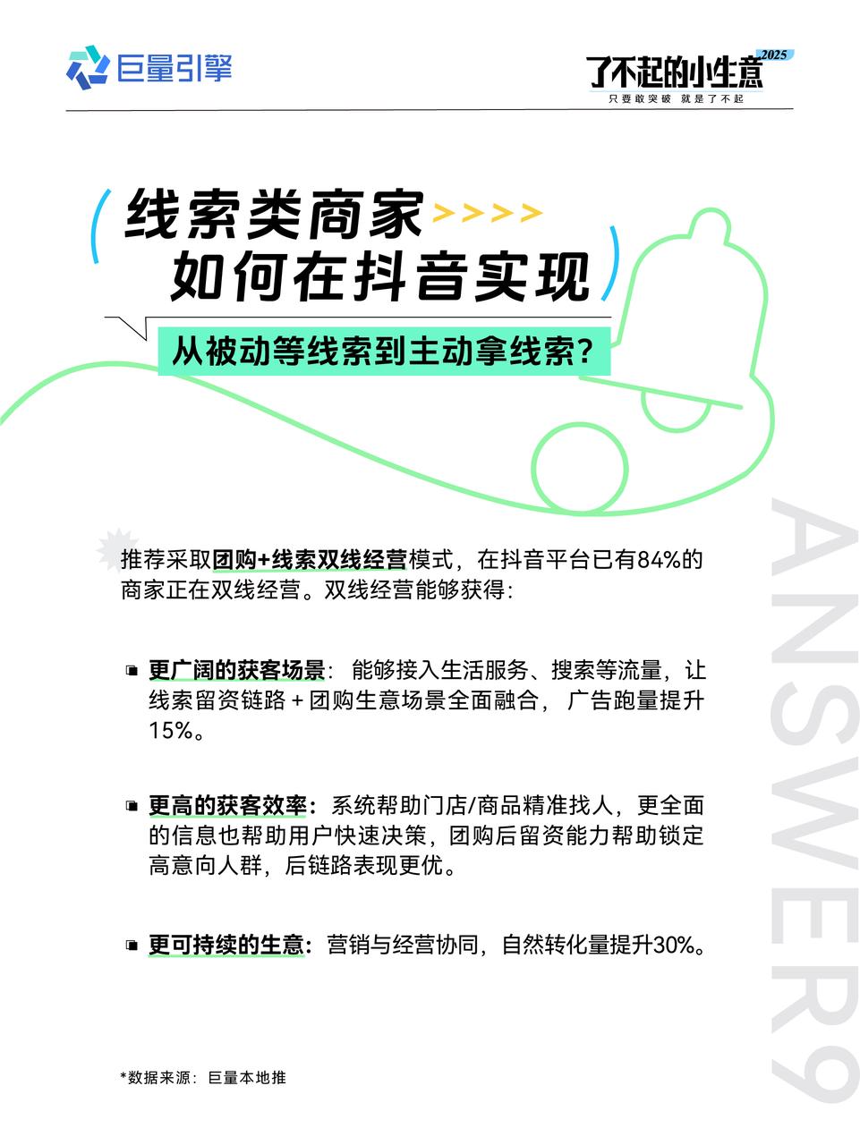 為高效解決商家困惑,巨量引擎帶來(lái)了電商生意場(chǎng)景與本地生意場(chǎng)景的年度核心疑問(wèn)的答疑,從內(nèi)容場(chǎng)到貨架場(chǎng),從本地團(tuán)購(gòu)交易到線(xiàn)索經(jīng)營(yíng),一一答疑解惑,撥開(kāi)迷霧,讓更多的小生意在 2025 年都可以實(shí)現(xiàn)一次又一次的 「大突破」!