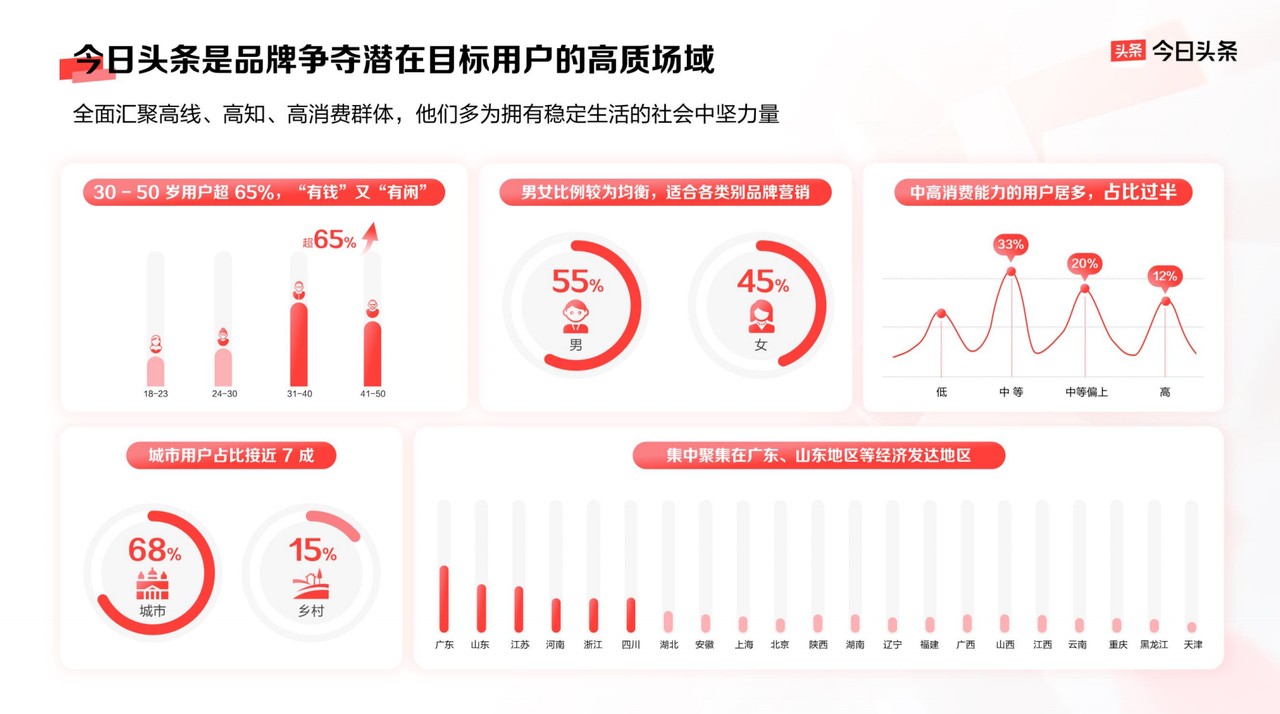 第一、高凈值用戶聚集。 數(shù)據(jù)顯示,今日頭條月活躍用戶高達(dá)數(shù)億,其中30-50歲用戶超65%,正是當(dāng)下社會“有錢”又“有閑”的人群,中高消費能力占比近半,城市用戶占比接近7成,匯集高線、高知、高消費群體,是擁有穩(wěn)定生活的社會中堅力量,可以說都是當(dāng)下的主流成熟消費人群,也正是各大品牌爭奪得潛在目標(biāo)用戶。