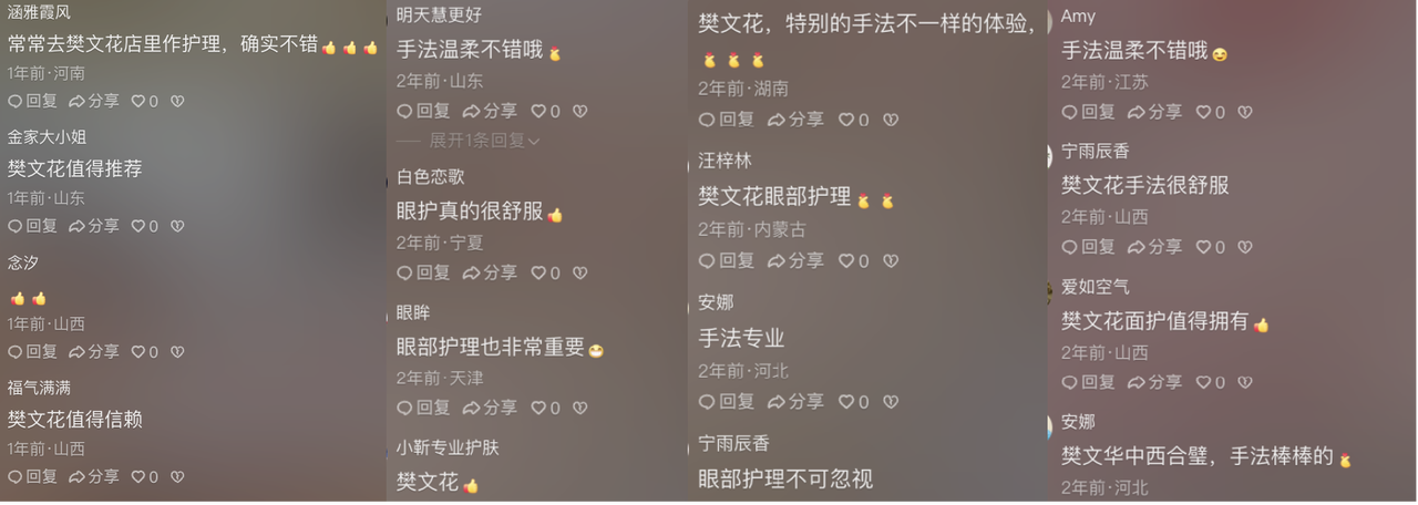 2022年4月,樊文花面部護(hù)理進(jìn)駐抖音生活服務(wù),開通官方抖音號(hào),更新膚質(zhì)類型分析、提拉緊致手法等短視頻,嘗試上架清潔補(bǔ)水和特色抗皺/修護(hù)/嫩膚/清顏團(tuán)購(gòu),吸引網(wǎng)友主動(dòng)“匯報(bào)”自己的面部狀態(tài),詢問屬于哪種膚質(zhì)。哪怕沒有線下路過樊文花門店,但越來越多對(duì)美容保養(yǎng)感興趣的用戶開始記住了樊文花面部護(hù)理。