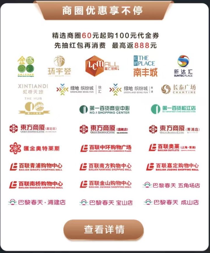 24小時(shí)營業(yè)的便利店是一座城市的溫情燈塔,特別是在午夜后,臨街的店鋪大多已經(jīng)打烊,只有各家便利店,仍燈火通明地在深夜中堅(jiān)守。上海的便利店是一道獨(dú)特的城市“風(fēng)景線”,根據(jù)相關(guān)報(bào)告,其便利店數(shù)量穩(wěn)居全國第一。此次“魔都萬家商戶5折起”活動中,上海超1600家便利店購物5折起,客戶在7-11、羅森、全家等便利店買單時(shí),更可享“一招過”隨機(jī)立減活動。 商圈作為城市的地標(biāo)性綜合體,既是城市發(fā)展的烙印,也是市民“一站式”吃喝玩樂購的重要場所。此次“魔都萬家商戶5折起”活動,招行信用卡客戶可在不同商圈分別參與60元起購100元指定商圈消費(fèi)券,或抽招財(cái)紅包,最高可享888元返現(xiàn)。參與的商圈都是上海極具代表性的,涵蓋金橋國際、虹橋天地、虹橋南豐城、第一八佰伴等近30家人氣商場。