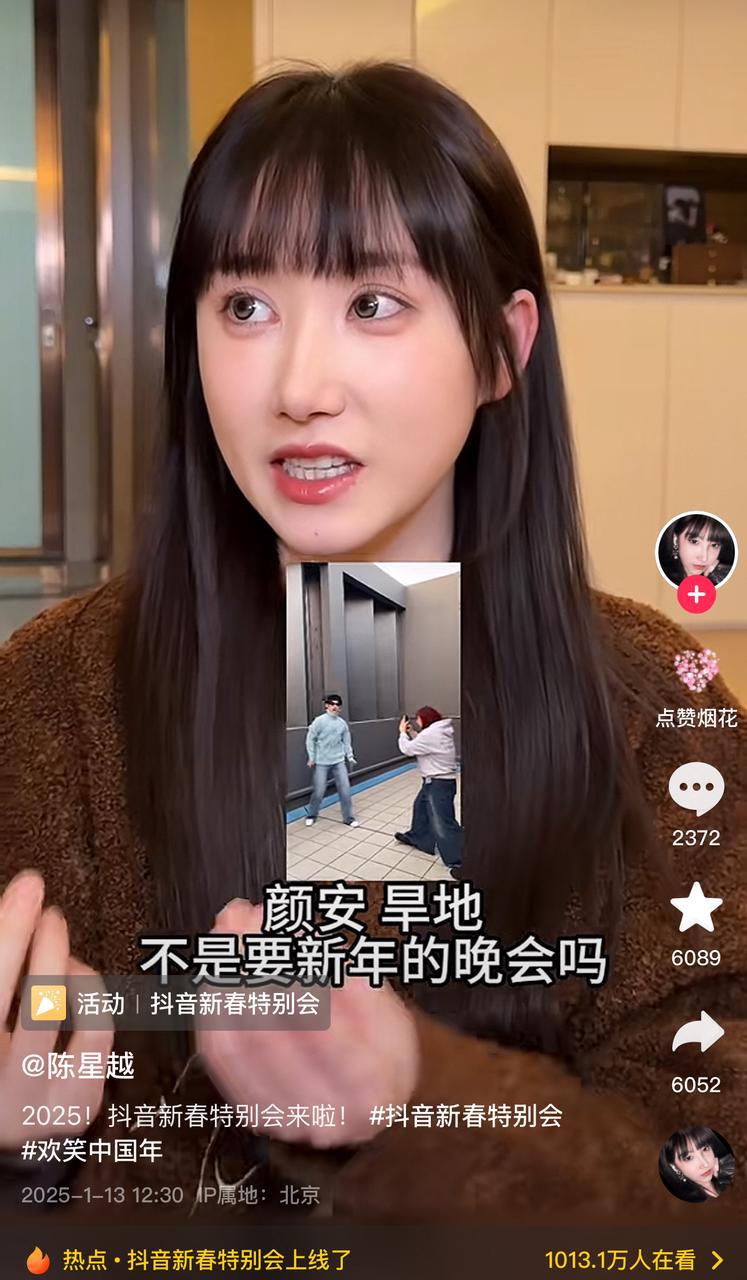 而憑借《永夜星河》大火的丁禹兮,也再次callback了自己在抖音上大火的熱梗“炸火花,破!”送大家一場新年煙花,與萬千劇粉的期待雙向奔赴。無論是“主包”還是“炸火花”,都源自抖音平臺的原生熱點,可見在明星選擇上,“抖音新春特別會”并非“唯流量論”,而是看中明星本人與平臺內(nèi)容生態(tài)的契合度。節(jié)目上線當晚,顏安還在自己直播間直播陪看節(jié)目,這種真人感強互動,不管是為節(jié)目還是為自身,都實實在在拉了一波好感度。