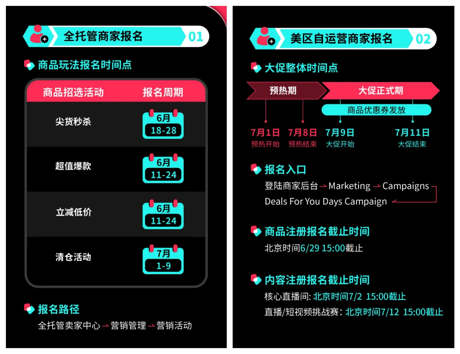TikTok Shop發(fā)布的時(shí)間表顯示,全托管商家可在6月11日起報(bào)名超值爆款、尖貨秒殺、立減低價(jià)、清倉(cāng)活動(dòng)等商品招選活動(dòng)。POP自運(yùn)營(yíng)商家則需在6月29日前完成商品注冊(cè)報(bào)名。