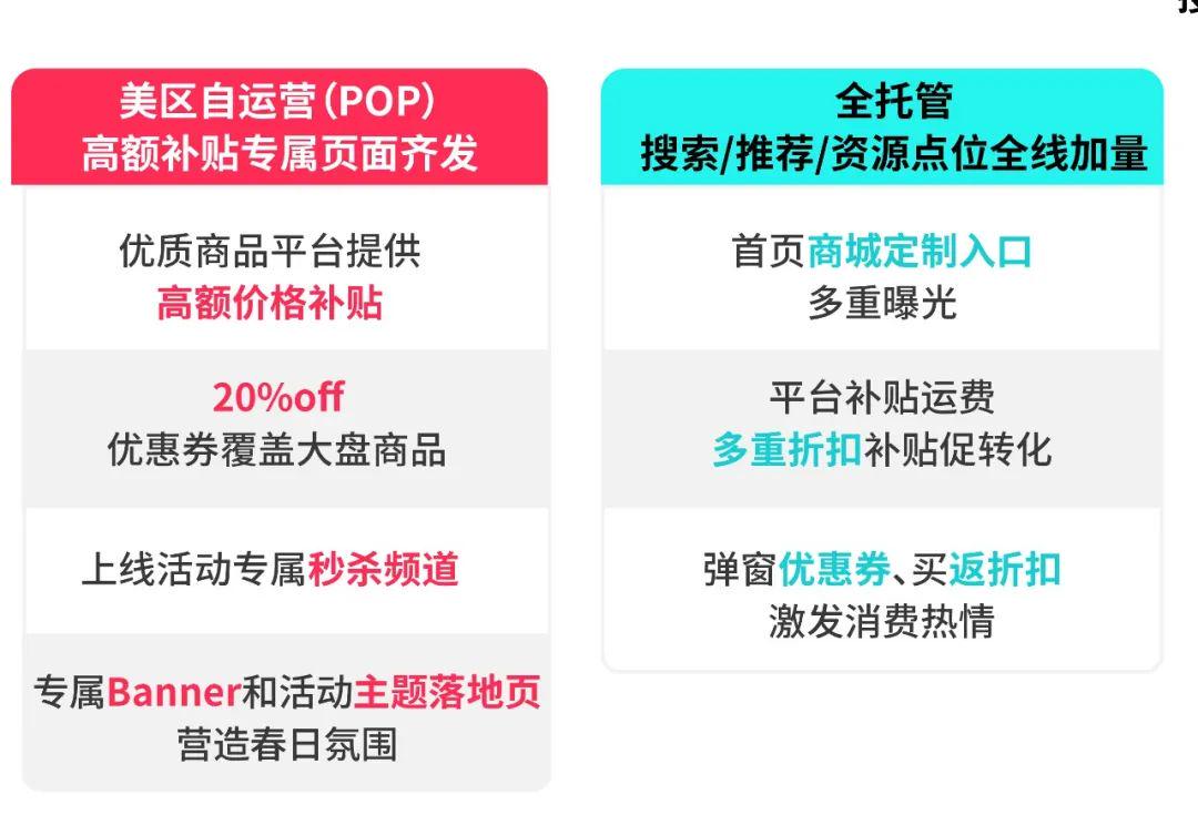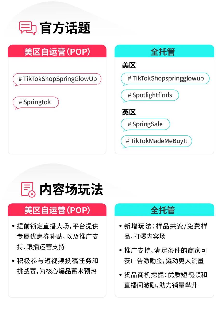 在本次春季大促期間,TikTok Shop針對美區(qū)自運營(POP)商家、全托管商家推出了豐富玩法,通過提供商品補貼、內(nèi)容玩法、商城頻道曝光等,助力商家春促大賣。