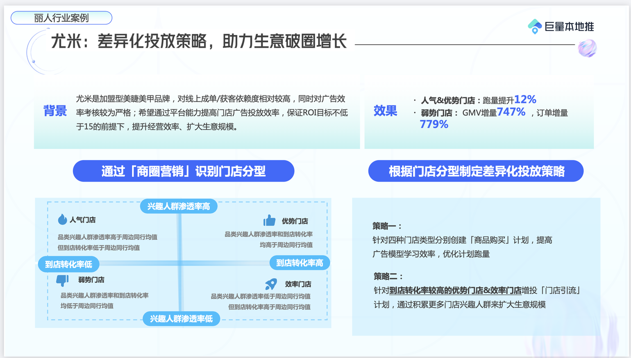 麗人行業(yè)的尤米,通過「商圈營銷」識別門店分型,并根據(jù)分型制定差異化投放策略,從而助力生意破圈增長。最終實現(xiàn)人氣&優(yōu)勢門店跑量提升12%,弱勢門店GMV增量747%,訂單增量779%。