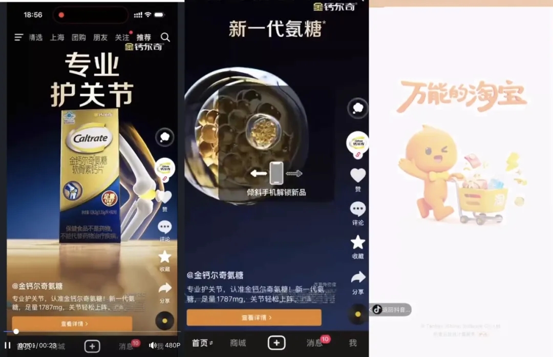 在通過(guò)開屏實(shí)現(xiàn)強(qiáng)曝光,成功搶占用戶注意之后,鈣爾奇依托高溢出高搜索勢(shì)能,打通抖音信息流與搜索端,以多次復(fù)觸品牌關(guān)鍵人群,持續(xù)強(qiáng)化用戶心智,塑造品牌形象與好感度。