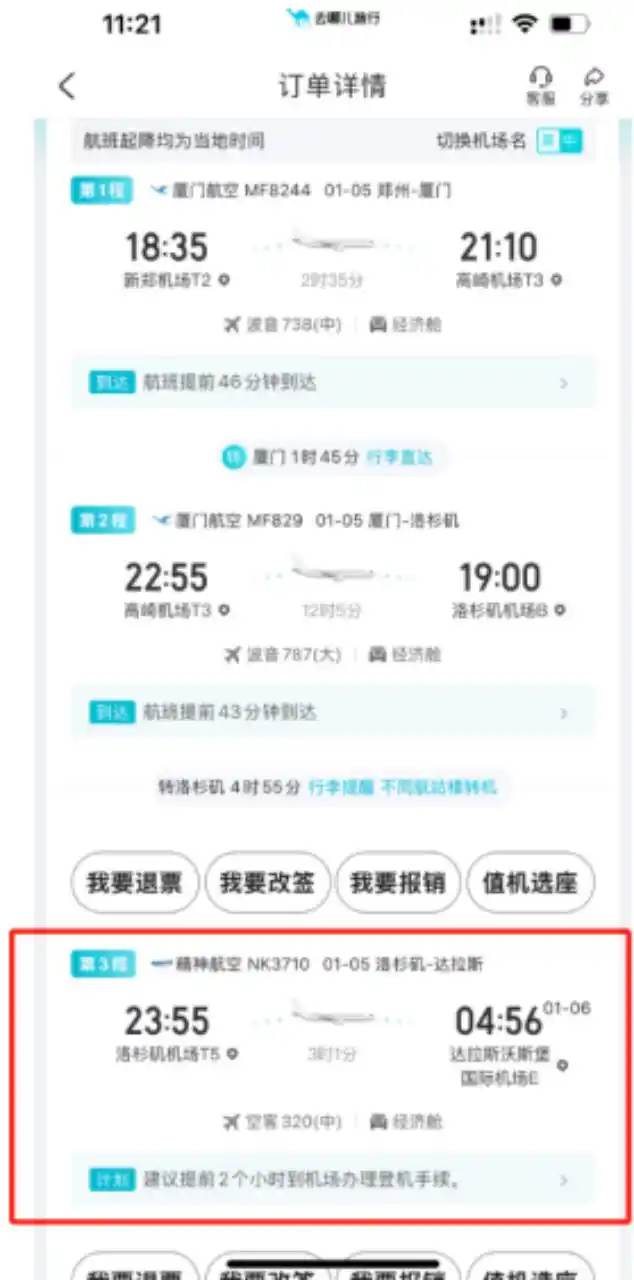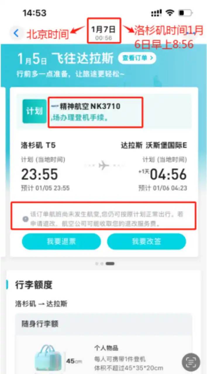 據(jù)林女士介紹,2024年11月15日,她通過“去哪兒網(wǎng)”APP為女兒購買了鄭州-廈門-洛杉磯-達拉斯的聯(lián)程機票,總費用14301元。按原計劃,2025年1月5日飛抵洛杉磯后,張貝爾應(yīng)轉(zhuǎn)乘當晚23:55起飛的“精神航空”航班前往達拉斯,由學校老師接機。然而,值機時卻突發(fā)變故——因航空公司破產(chǎn),航班已被取消。