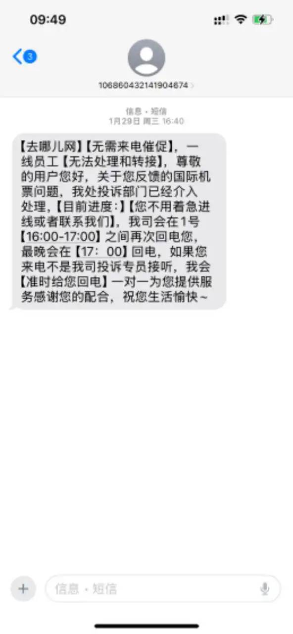 林女士收到的平臺短信,此后并未接到去哪網(wǎng)的電話