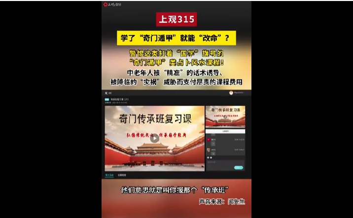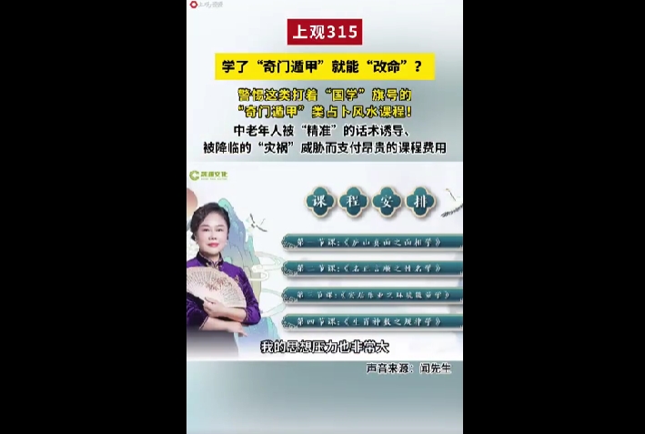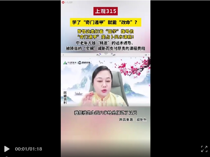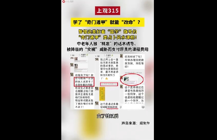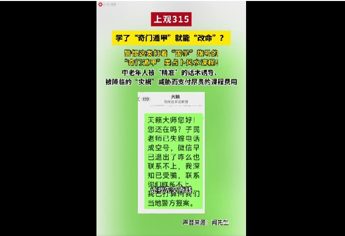 近幾年,打著“國學(xué)”旗號的“奇門遁甲”類占卜風(fēng)水課程在社交平臺興起,吸引大量對古代文化、養(yǎng)生知識感興趣的中老年人。不少銀發(fā)群體被“精準(zhǔn)”的話術(shù)誘導(dǎo)、被降臨的“災(zāi)禍”威脅而支付昂貴的課程費用,在真正學(xué)習(xí)時,發(fā)現(xiàn)課程內(nèi)容、售后服務(wù)縮水嚴(yán)重。大量投訴涌現(xiàn)在社交平臺,機構(gòu)人員也多方失聯(lián)。